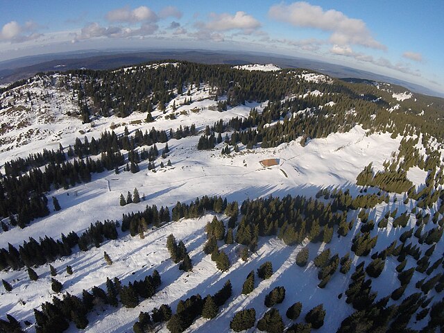 Snow-draped forests stretch across Le Noirmont in the Jura Mountains, western Switzerland. Photo: Oleksiy Muzalyev/Wikimedia Commons (CC BY-SA 4.0).