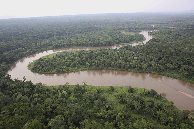 A river winds through dense rainforest in North Kivu, eastern Democratic Republic of the Congo.