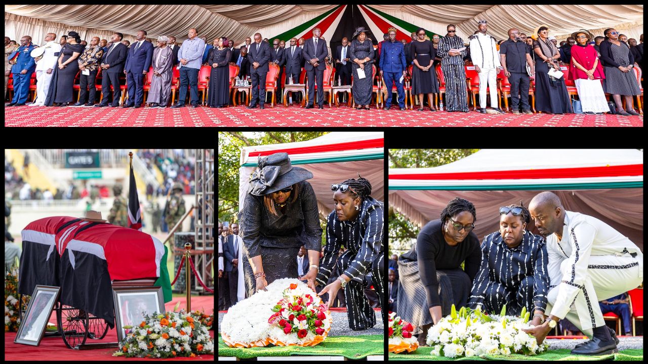 Honoring Baba: President William Ruto bows before the flag-draped casket of former Prime Minister Raila Amolo Odinga during the state funeral in Bondo, Siaya County. In other moments, Mama Ida Odinga views her husband’s body alongside their son Raila Odinga Jr., former President Uhuru Kenyatta lays a wreath in tribute, and Mama Ida is assisted by her daughter Winnie Odinga as they place a floral wreath at the graveside. The solemn ceremony drew national and international leaders in a final farewell to the veteran opposition leader.